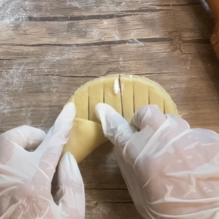 10-Yarım ay şeklindeki hamurun bir tanesine( Üstte 0,5 cm bırakarak) hamurun yarısına kadar gelecek şekilde 3 çizik attım.